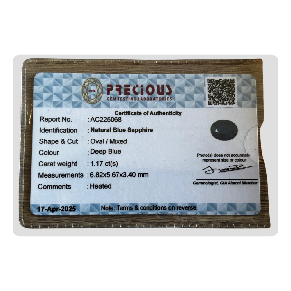 This natural deep blue sapphire oval gemstone features a rich deep blue color description. This oval sapphire comes with certification AC225068, ensuring authenticity and quality. Its intense hue makes it ideal for a striking blue sapphire necklace. Perfect for a blue sapphire stone setting, this natural gemstone is an excellent choice for those looking for a high-quality deep blue sapphire.