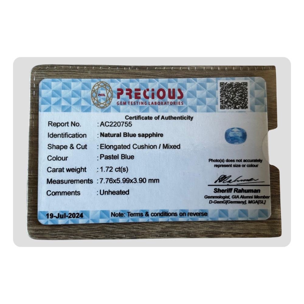 This unheated natural pastel blue sapphire elongated cushion gemstone features a soft pastel blue tone. This elongated cushion sapphire comes with certification AC220755, ensuring authenticity and quality. Its rare unheated quality makes it ideal for a blue sapphire necklace. Perfect for a custom blue sapphire stone, this natural gemstone is an excellent choice for those looking for a high-quality pastel blue sapphire.