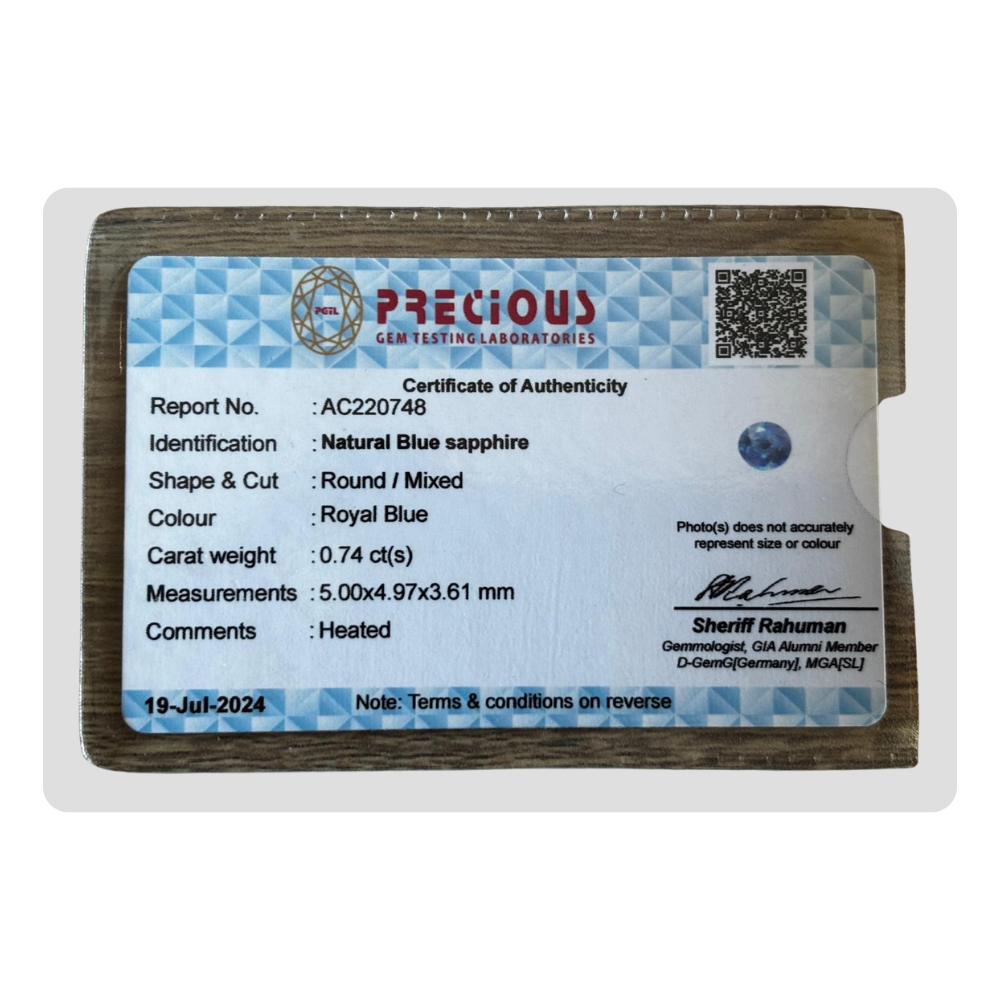 This natural royal blue sapphire round gemstone features an intense royal blue tone. This round sapphire comes with certification AC220748, ensuring authenticity and quality. Its brilliant sparkle makes it ideal for a blue sapphire pendent. Perfect for a royal blue gemstone collection, this natural gemstone is an excellent choice for those looking for a high-quality royal blue sapphire.