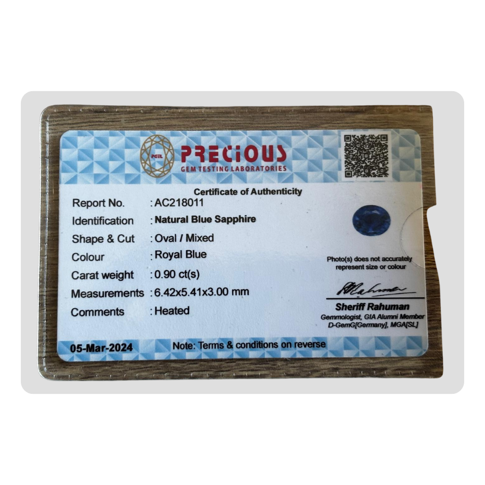 This natural royal blue sapphire oval gemstone features a deep royal blue tone. This oval sapphire comes with certification AC218011, ensuring authenticity and quality. Its refined elegance makes it ideal for a blue sapphire pendent. Perfect for a custom royal blue ring, this natural gemstone is an excellent choice for those looking for a high-quality royal blue sapphire.