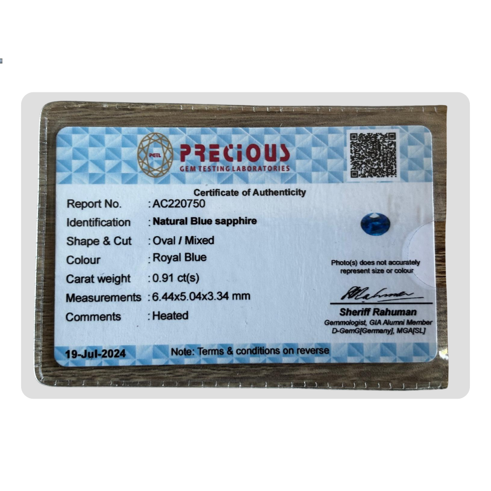 This natural royal blue sapphire oval gemstone features a striking royal blue color. This oval sapphire comes with certification AC220750, ensuring authenticity and quality. Its rich saturation makes it ideal for a blue sapphire pendent. Perfect for exquisite sapphire jewellery, this natural gemstone is an excellent choice for those looking for a high-quality royal blue sapphire.