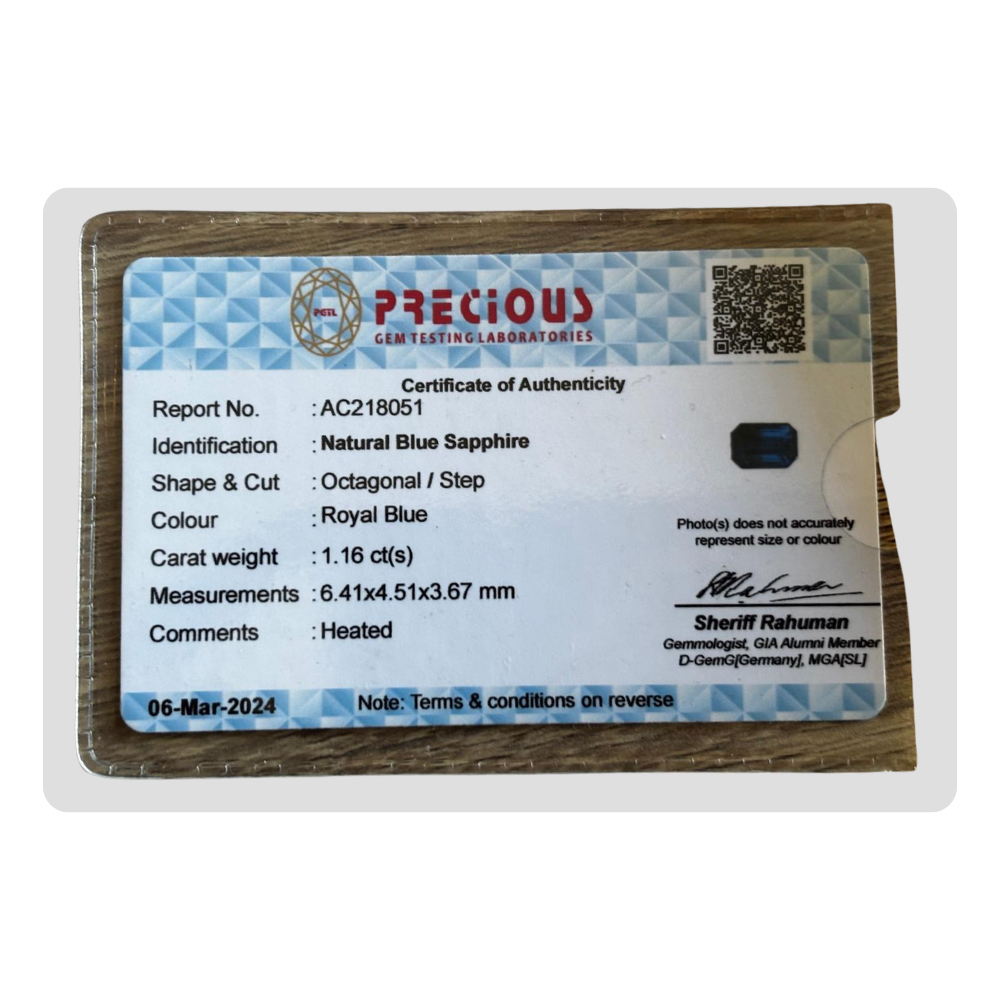 This natural royal blue sapphire octagonal gemstone features a bold royal blue tone. This octagonal sapphire comes with certification AC218051, ensuring authenticity and quality. Its unique geometric cut makes it ideal for a modern blue sapphire engagement ring. Perfect for a distinct royal blue ring, this natural gemstone is an excellent choice for those looking for a high-quality royal blue sapphire.