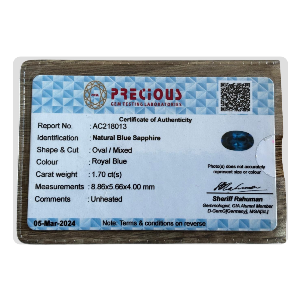 Natural Royal Blue Sapphire — 1.70 Carat (Unheated)