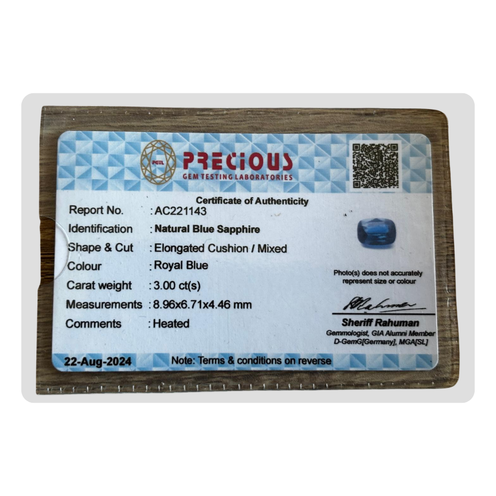 This natural royal blue sapphire elongated cushion gemstone features a majestic royal blue saturation. This elongated cushion sapphire comes with certification AC221143, ensuring authenticity and quality. Its massive 3 Ct size makes it ideal for a stunning royal blue gemstone centerpiece. Perfect for a luxury blue sapphire engagement ring, this natural gemstone is an excellent choice for those looking for a high-quality royal blue sapphire.