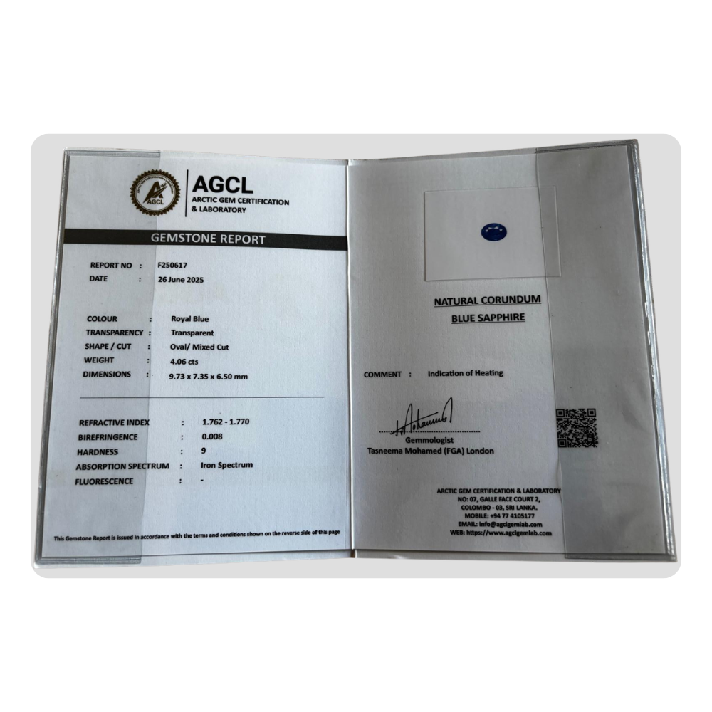 This natural royal blue sapphire oval gemstone features a monumental royal blue hue. This oval sapphire comes with certification F250617, ensuring authenticity and quality. Its massive 4.06 Ct size makes it ideal for a striking blue sapphire necklace. Perfect for luxurious sapphire jewellery, this natural gemstone is an excellent choice for those looking for a high-quality royal blue sapphire.