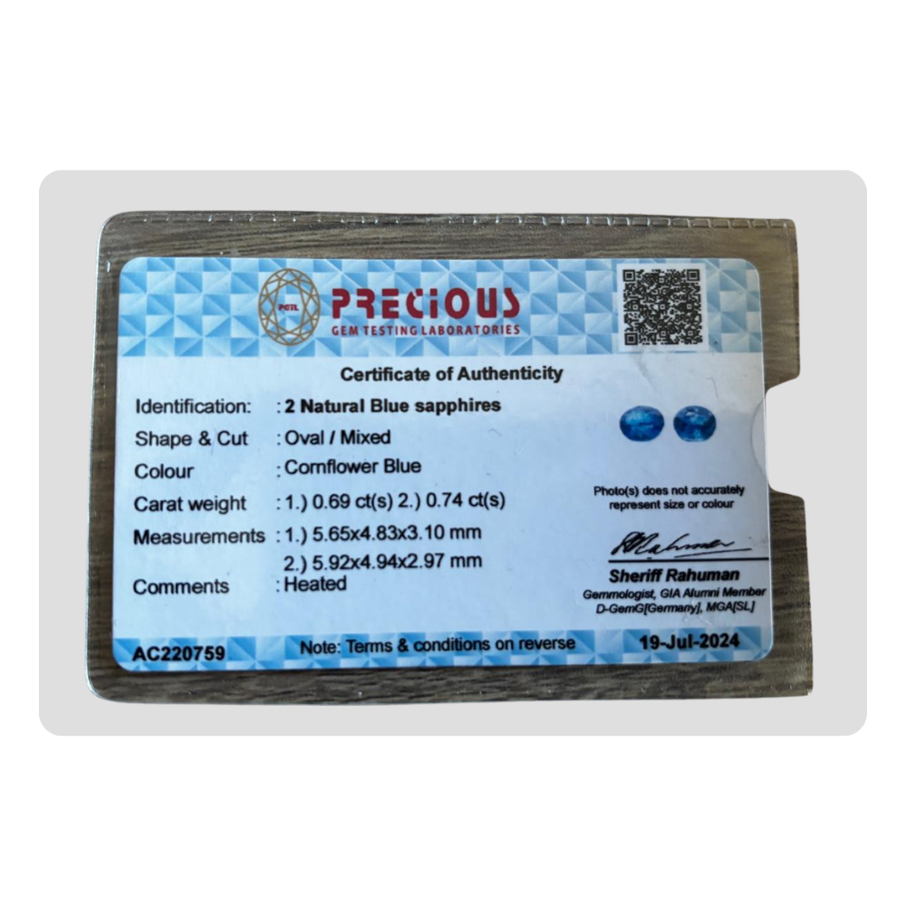 This natural cornflower blue sapphire oval gemstone pair features a stunning cornflower blue tone. This oval sapphire pair comes with certification AC220759, ensuring authenticity and quality. Its matched brilliance makes it ideal for gorgeous blue sapphire earrings. Perfect for custom sapphire jewellery, this natural gemstone is an excellent choice for those looking for a high-quality cornflower blue sapphire.